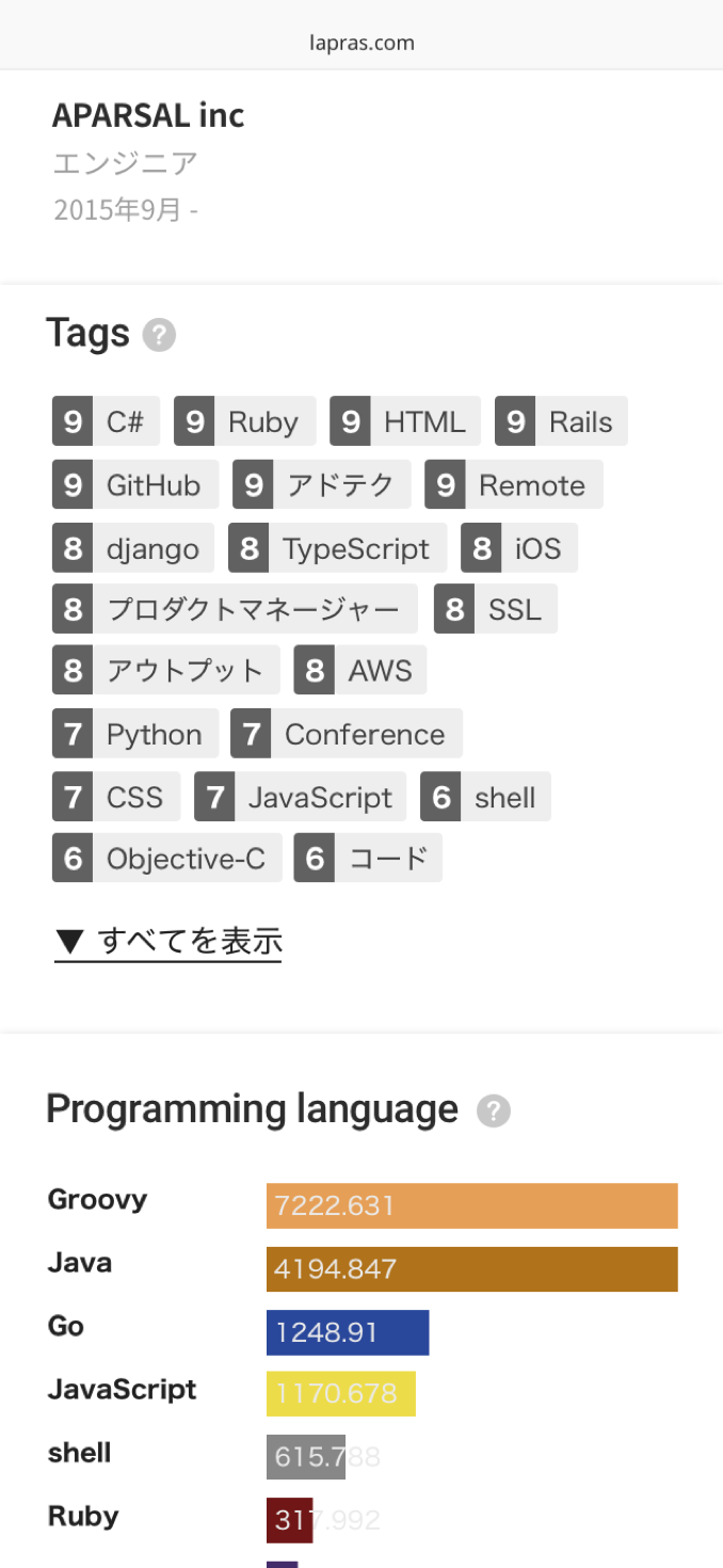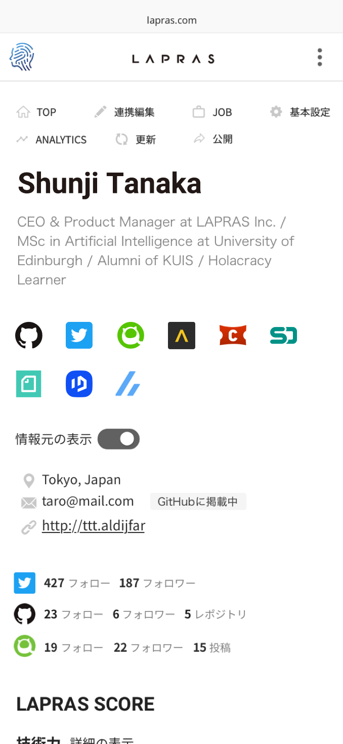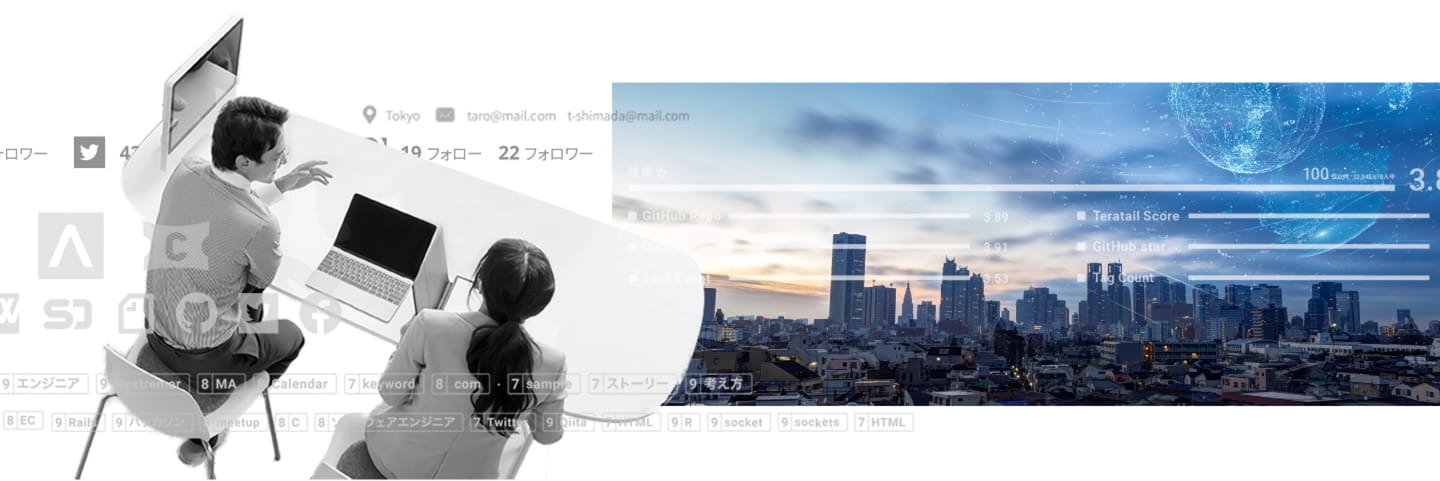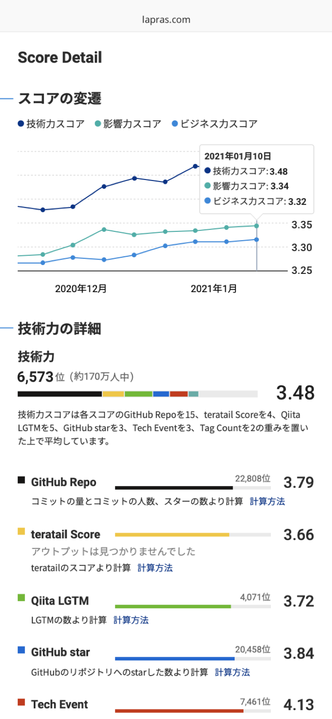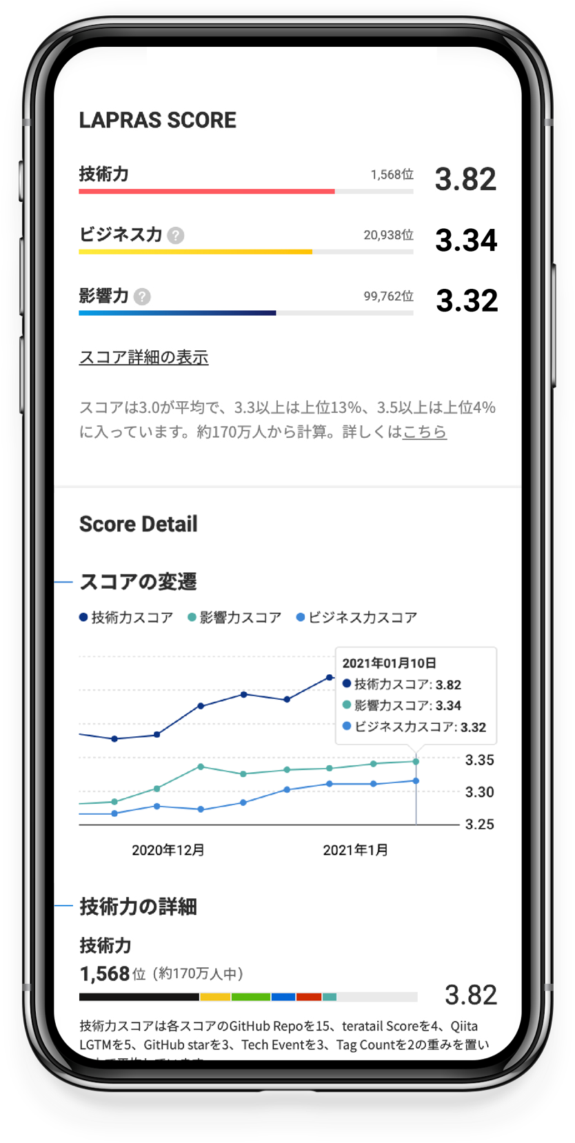 インターネット上で公開されているアウトプットに基づいて、統計的に評価・分析し、LAPRAS独自のスコアを算出。GitHub、技術記事、技術イベント、スキルタグの4つの項目で評価されます。