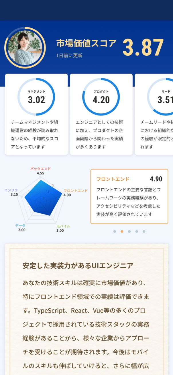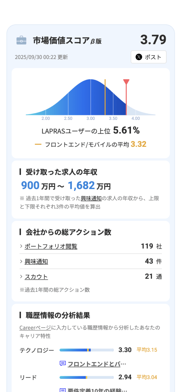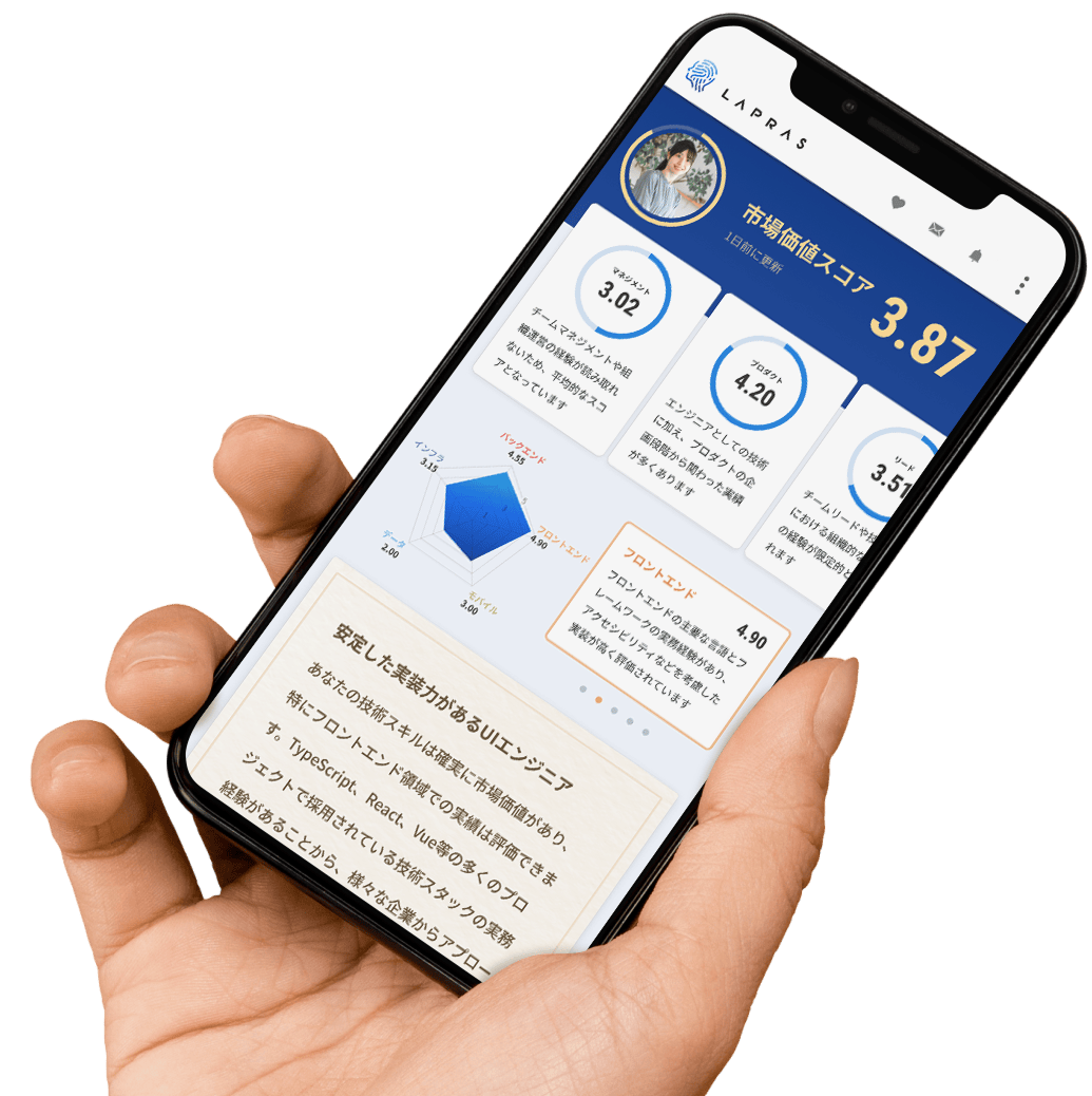 職歴や経験技術を入力することで、現在のエンジニアの求人トレンドや、他LAPRASユーザーの経験情報を踏まえて客観的に市場価値をスコア化。