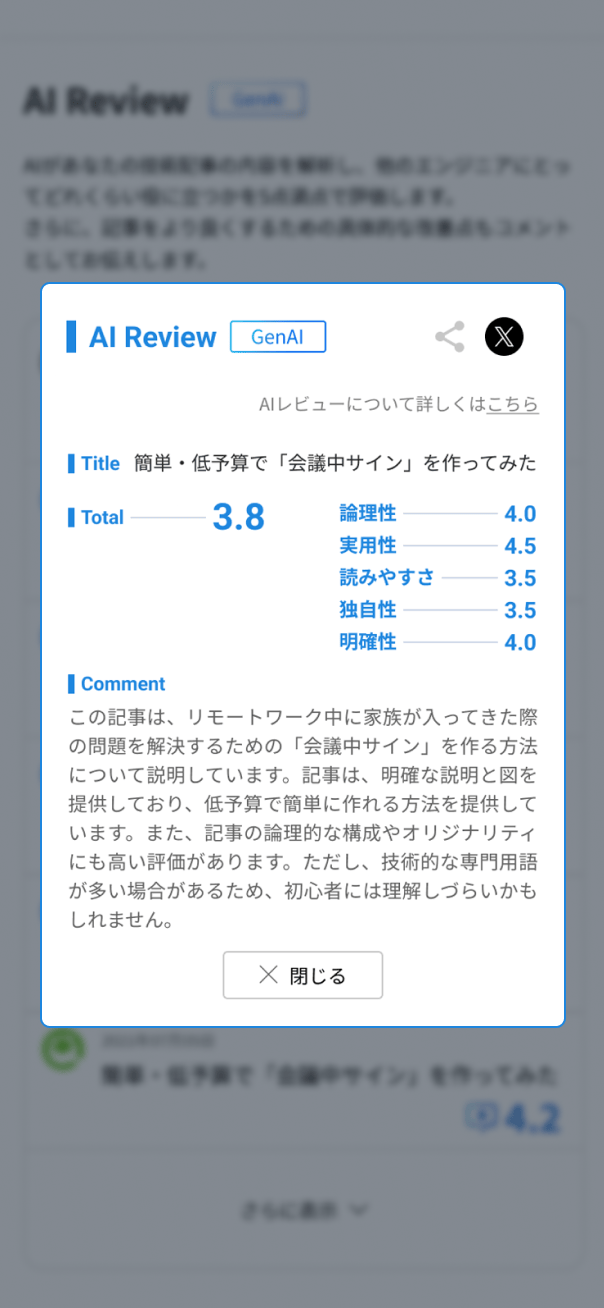 LLMがブログ記事の中身をチェックし、記事の品質をLAPRAS独自の評価ロジックでスコアリング。さらに、記事の内容にまで踏み込んで、客観的な評価コメント、改善アドバイスがもらえます
