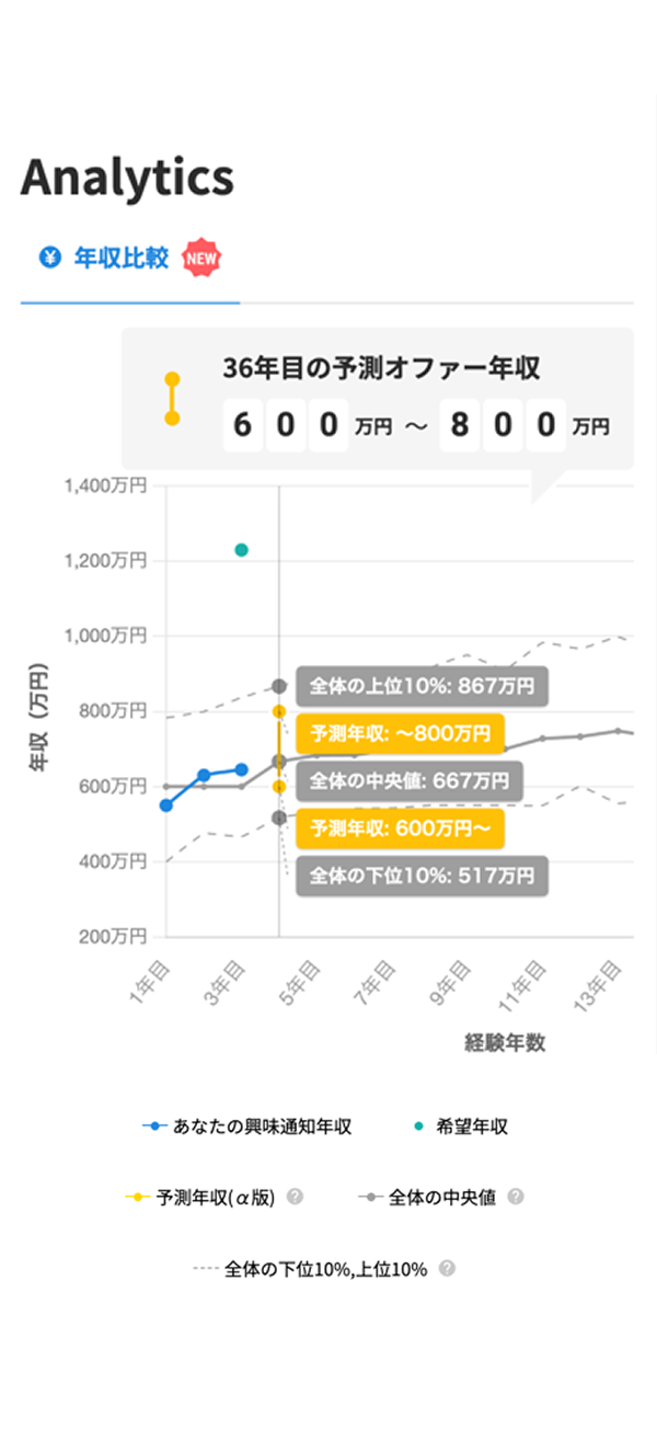 エンジニア経験年数ごとに「企業からのオファー提示年収」をグラフ化。LAPRASユーザー全体のデータが可視化されるため、自身の市場価値がどのあたりにあるのかを直感的に把握できます。