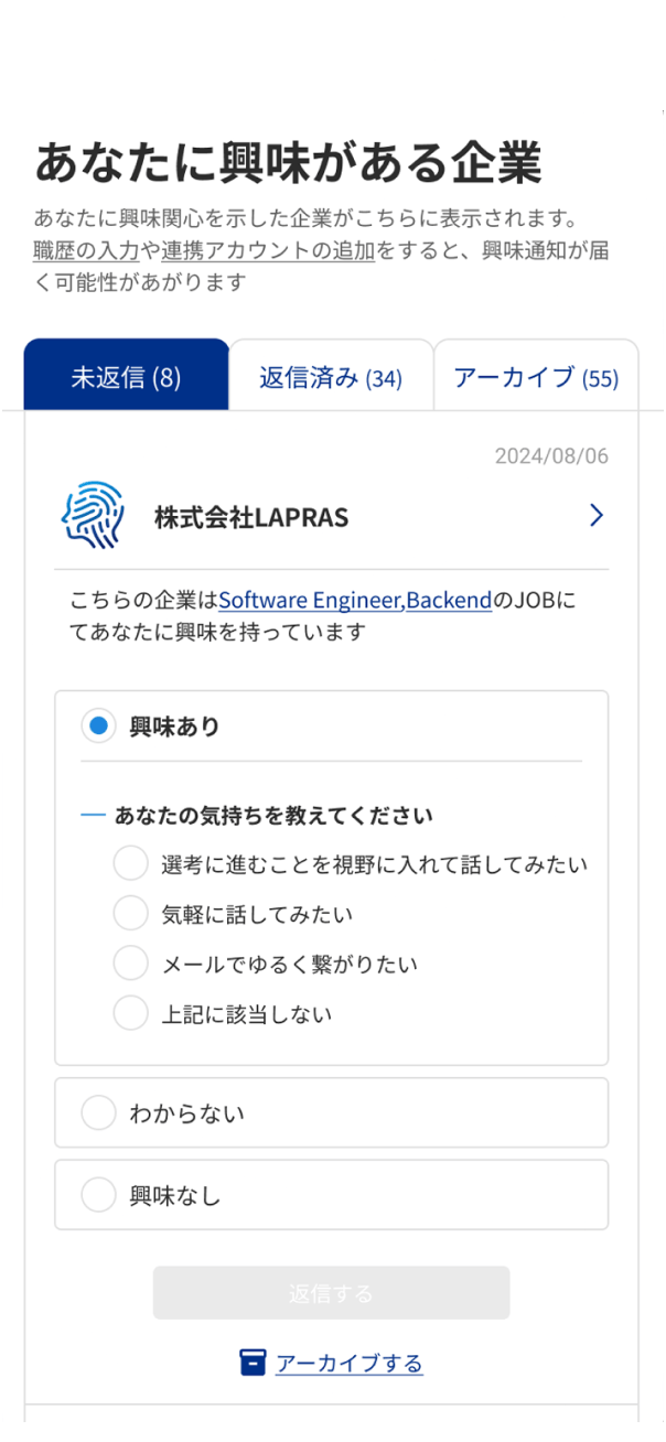 企業があなたに興味を持ったことを知ることができます。ボタンをクリックして、あなたの意思を伝えましょう