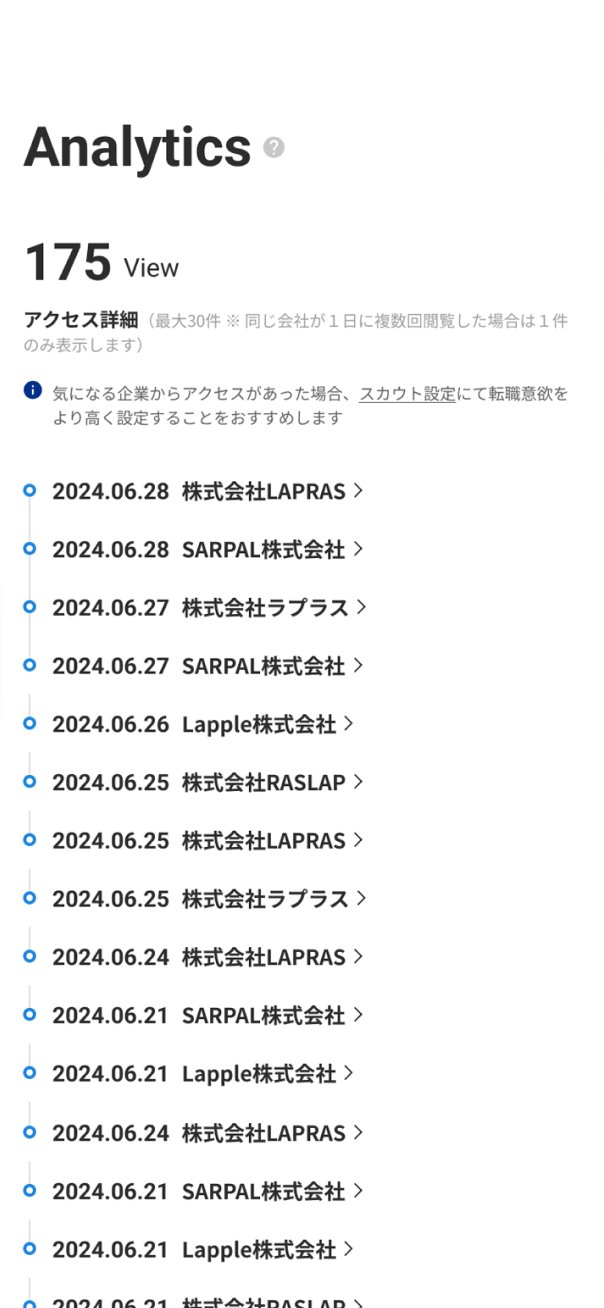 あなたのポートフォリオを閲覧した企業名を履歴として確認できるので、気になる企業を確認しましょう