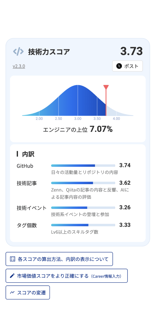 インターネット上で公開されているアウトプットに基づいて、統計的に評価・分析し、LAPRAS独自のスコアを算出。GitHub、技術記事、技術イベント、スキルタグの4つの項目で評価されます。